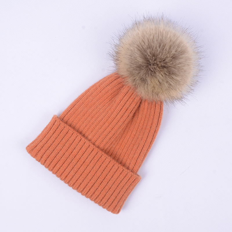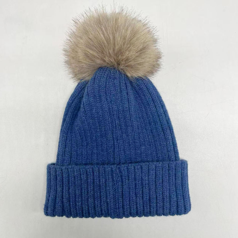Custom Logo Knitted Beanie Cap High Quality Faux Fur Winter Hats With Pom Pom for Kid Children