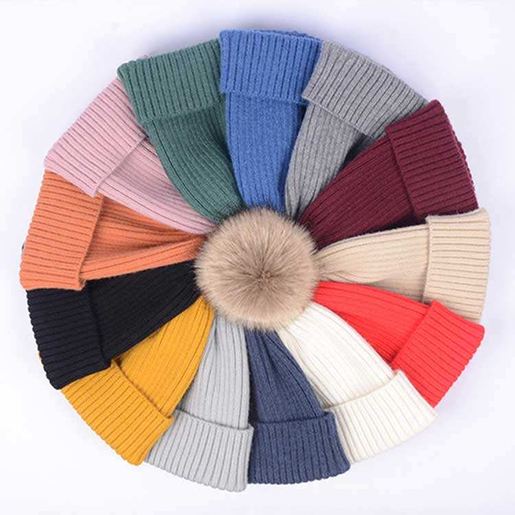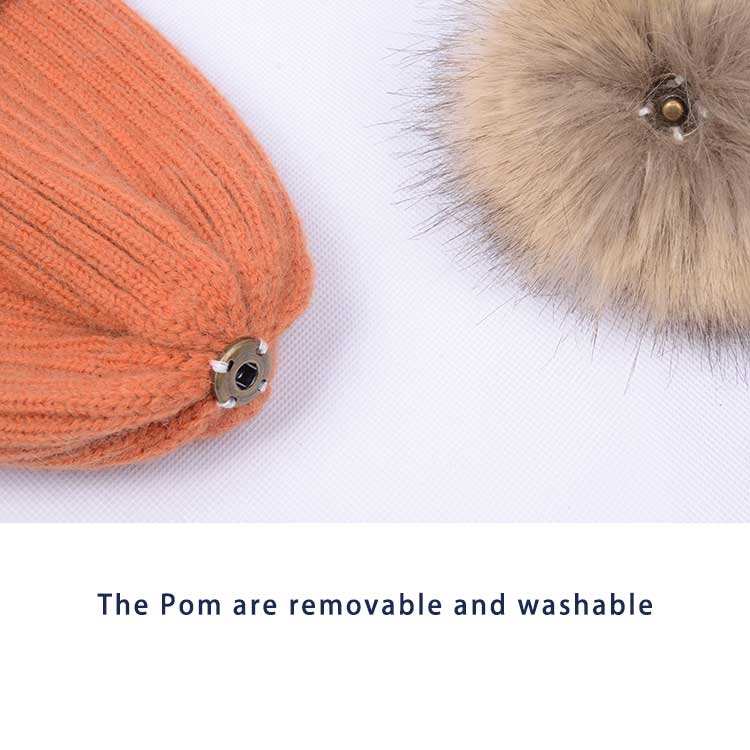 Custom Logo Knitted Beanie Cap High Quality Faux Fur Winter Hats With Pom Pom for Kid Children