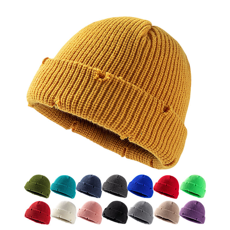 Wholesale Private Label Custom Worn Out Short Cuff Knit Hat Roll-up Edge Skull Cap Men Women Distressed Fisherman Beanie
